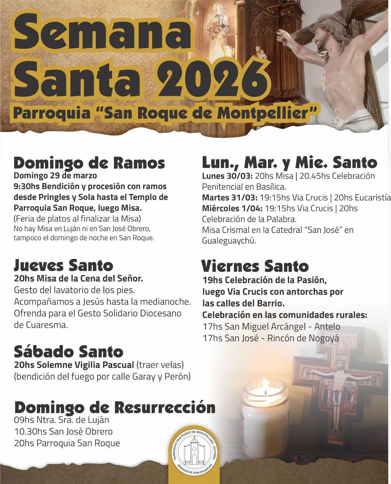 Por su parte, la parroquia San Roque de Montpellier también llevará adelante un cronograma que incluye la bendición y procesión de ramos por las calles del barrio, celebraciones litúrgicas, adoración eucarística y un Vía Crucis con antorchas, además de actividades en comunidades rurales.