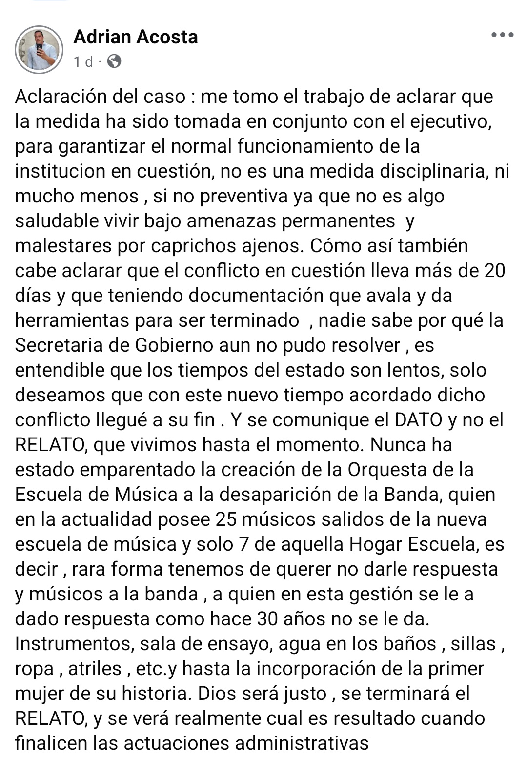En medio del conflicto que atraviesa la Banda Municipal de Música, el músico y coordinador de la Escuela de Música, Adrián Acosta, difundió un extenso mensaje en sus redes sociales para aclarar su situación tras su separación temporal de la organización.