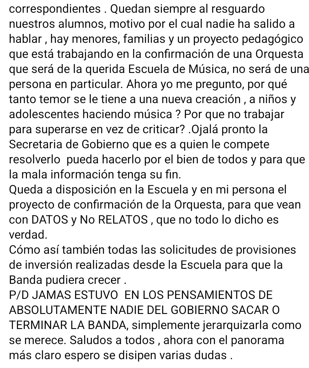 Uno de los puntos centrales de su descargo fue desmentir versiones que vinculan la creación de la Orquesta de la Escuela de Música con una eventual desaparición de la Banda. Por el contrario, sostuvo que el proyecto educativo ha nutrido al organismo musical, señalando que actualmente la mayoría de los integrantes provienen de la nueva escuela.